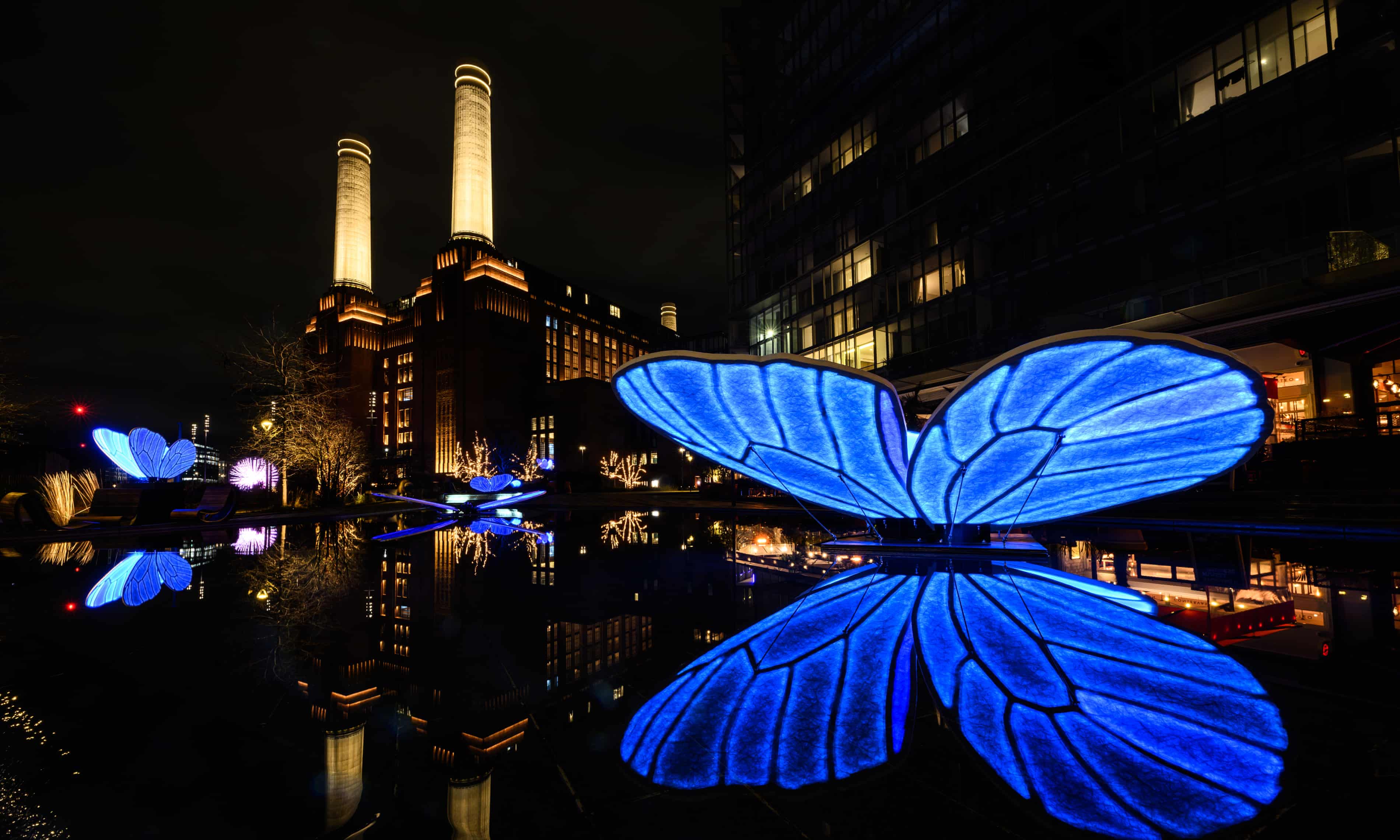 Butterfly Effect, an illuminated sculpture by Masamichi Shimada, in front of Turbine Hall at Battersea Power station in London, England.
