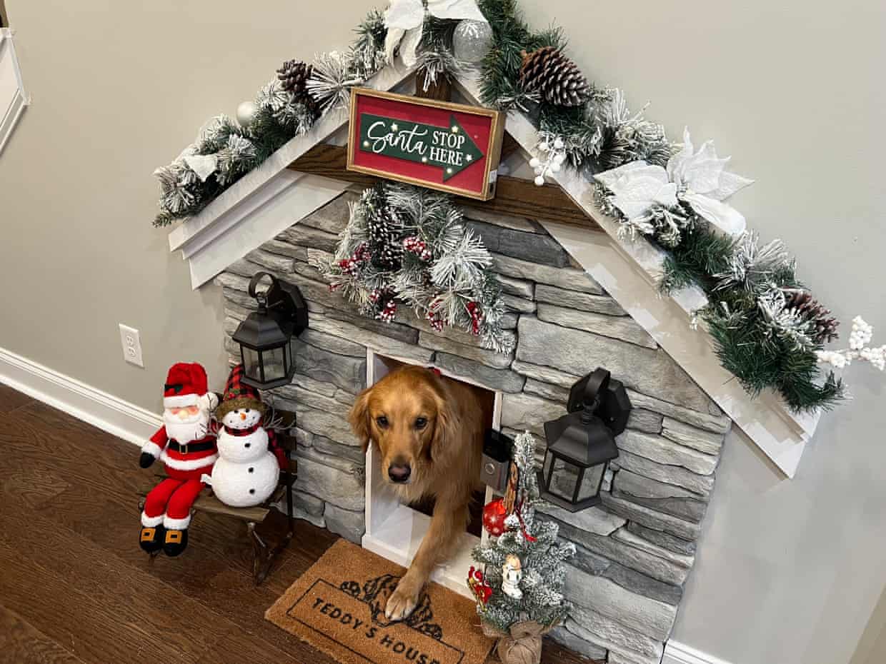 Teddy stepping out of his custom doghouse built by Johnathan Lower.